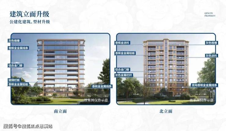 建筑立面采用南向铝板+LOW-E玻璃,搭配香槟金色金属线条,整体轻盈现代,充满镜面艺术感。