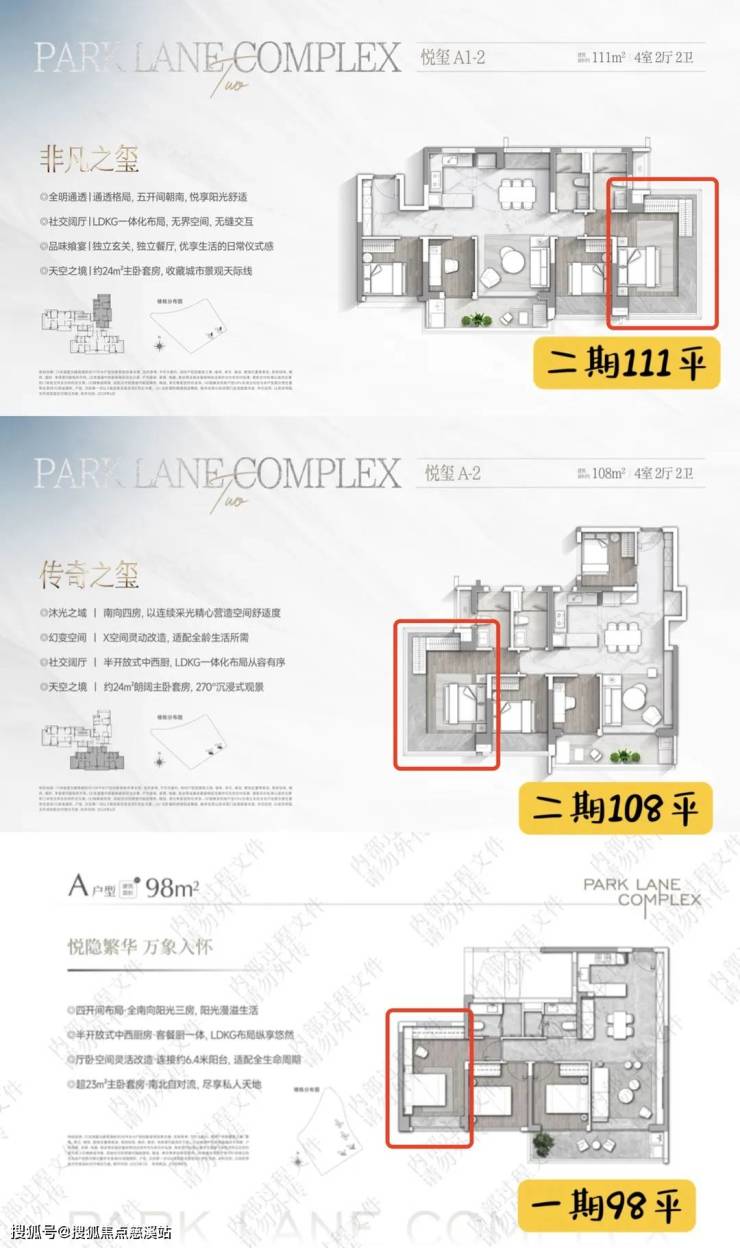 二期在售户型如下,建面约108-111-124平全南向纯四房。
