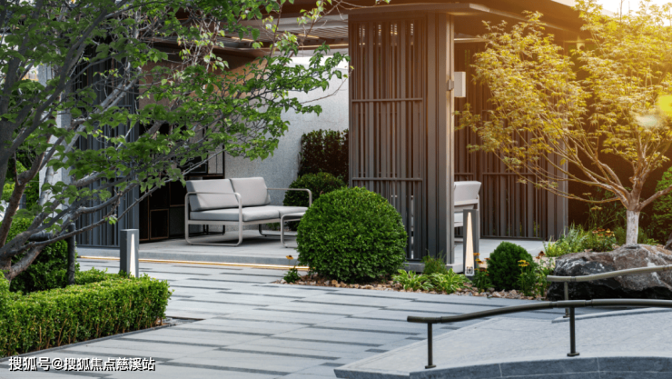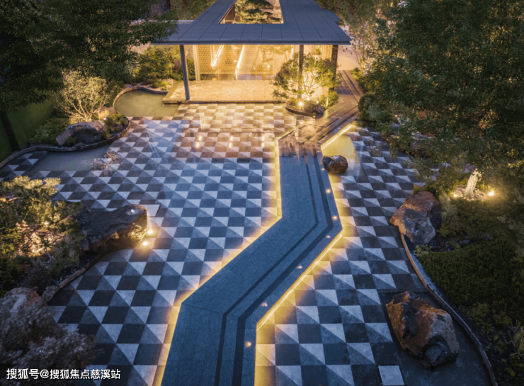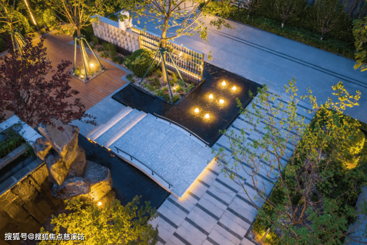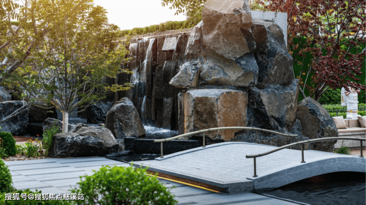 宅间景观中精心布置了休闲座椅,业主可以在此享受户外时光,与邻居自在交谈,这里成为了一个户外社交的“第二会客厅”。会客厅前置一叠石瀑布,瀑布以中国黑石皮堆叠而成,水流潺潺,静中有动,营造出江南水乡的雅致风情。水景区的廊架下方,黑色块石铺装与周边形成对比,让空间层次更为丰富。一道景观桥蜿蜒而下,步入下庭院,探寻后场花园的自然之美,为业主提供了充满趣味的游园体验。