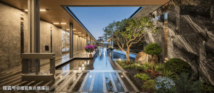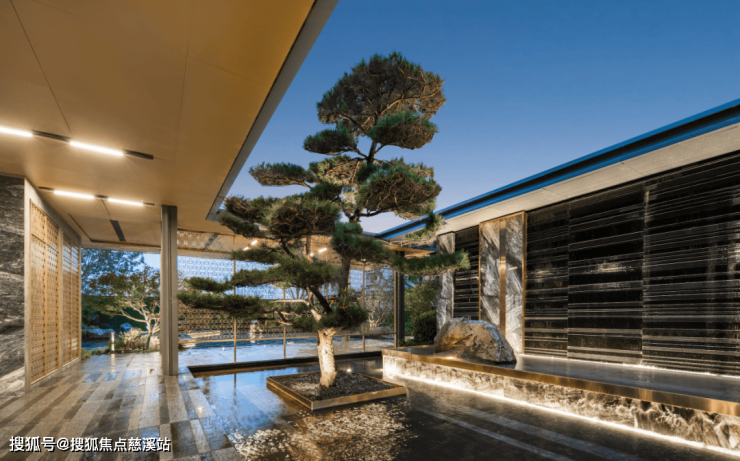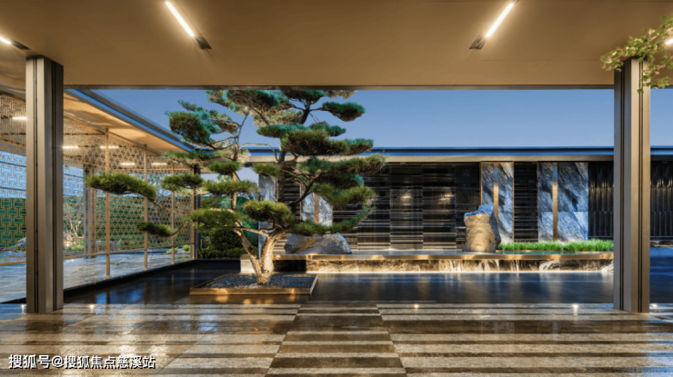 迎客松后面的背景水幕墙采用乌克兰幻影蓝石材,平面做了纹理处理,流水从上而下美感绝伦,其间巧置两块中国黄皮景石,一座个卧石,一座立石,两石之间四有交互,禅意十足,随之流水潺潺,如同一幅动态的诗意画作。