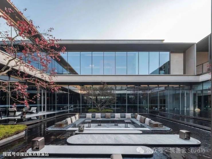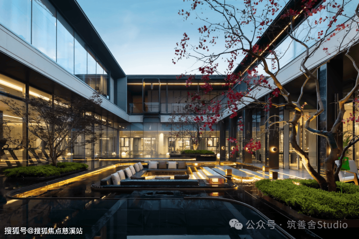 下沉式庭院,引入广阔镜面水景,水面上错落有致地布设景观绿植,与嵌入式休闲沙发会客区相映成趣,营造出既生动又高雅的空间氛围。每一园区皆蕴藏一个缩微宇宙,每一步履间,景色迭变。设计师们不仅为下沉庭院赋予了独特的主题风格,更致力于通过巧妙设计,让室内空间与自然景观无缝衔接,和谐共融。
