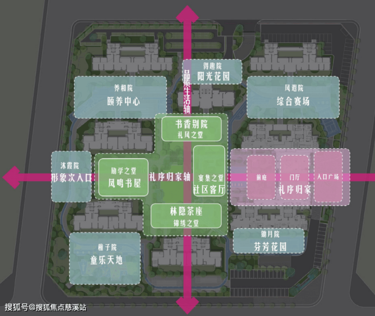 园林:≈2.3 万㎡,书院式“两轴四堂六院”