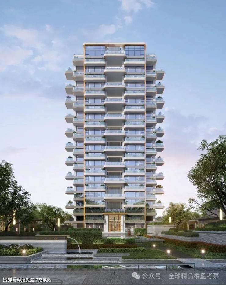整体立面,以大面积的曲面玻璃+弧形铝板设计主题轮廓,雕琢出玉石的温润感,连铝板材质,天珺都采用了三种不同的撞色搭配:整体以莫兰迪灰为主,南立面的卧室隔层,使用了星光银的配色,而横向和纵向的装饰线条,则使用了鎏光金。