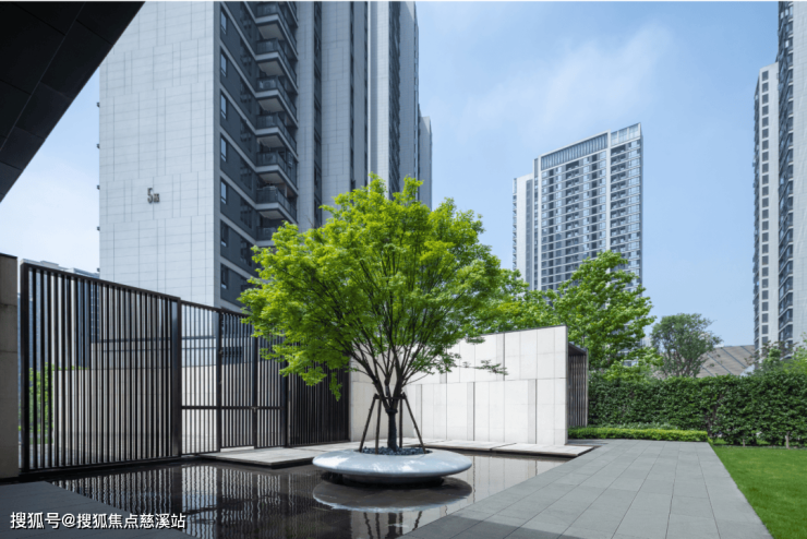 穿过入口府门,进入场地,左侧是一泓如镜的水面,生长于白玉盘般种植池中的紫薇树,独木成景,摇曳生姿,如同漂浮于水面之上,右侧整齐的绿篱辅以精致的金属框,序列的引导着人们前行。