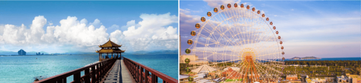 蜈支洲岛5A风景区、后海、妈祖庙、椰子洲岛、水稻国家公园、南田温泉、亚特兰蒂斯水世界、海昌梦幻海洋不夜城、HELLO KITTY主题乐园(在建中)等。