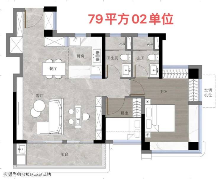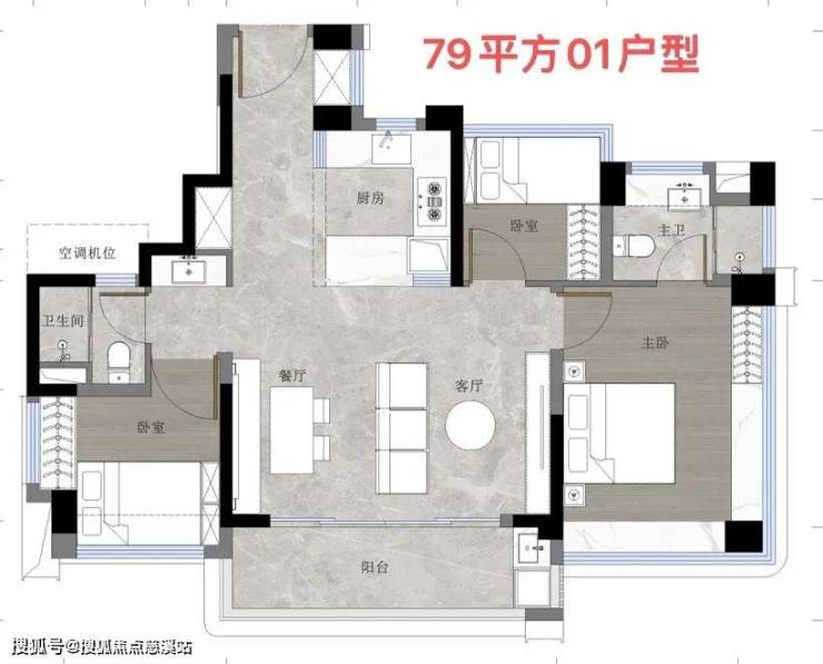 79方的A2户型,3房2卫,一样有5.3米面宽阔景阳台,以及270°大飘窗主卧。这个是飞机户型。