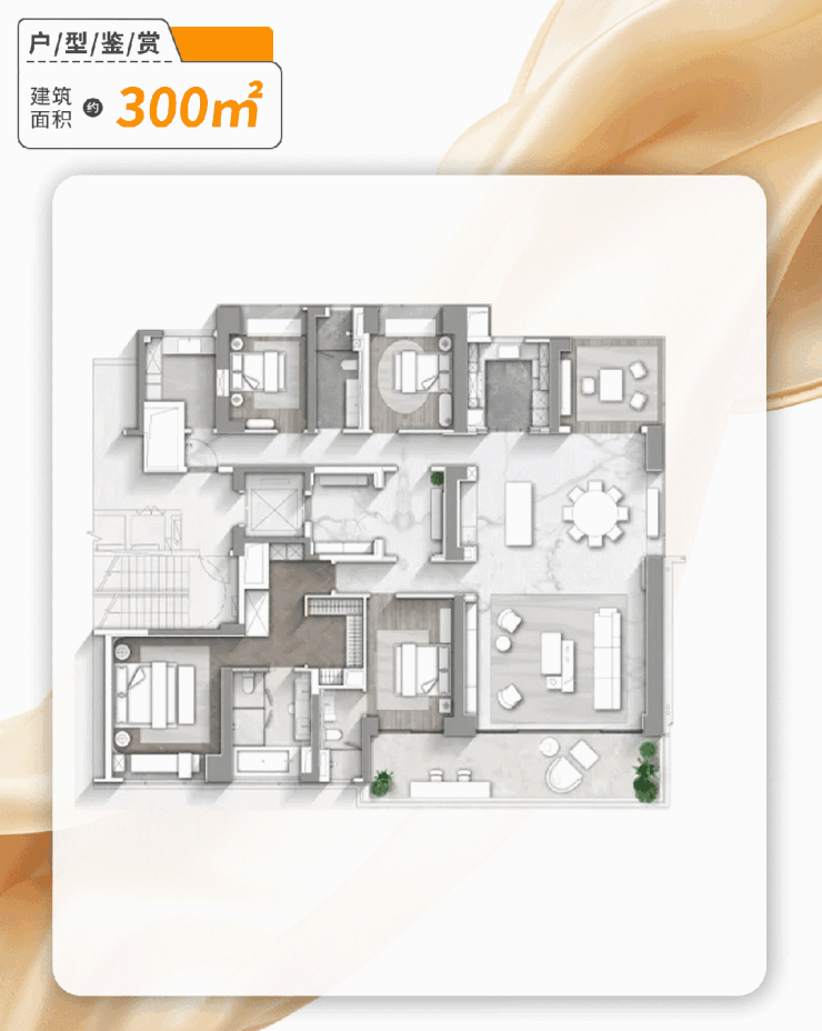 建筑面积约300㎡户型,三梯两户,双套房设计,在家就能看到长隆,沉浸式感受乐园的欢乐。