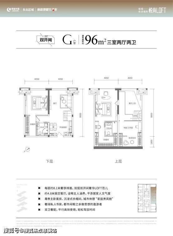 绿城桂语朝阳·悦尚LOFT建面约96㎡三房产品,卧室和客厅双开间尺度高达8.1米,挑空高厅约4.8米,百平米平层望尘莫及。