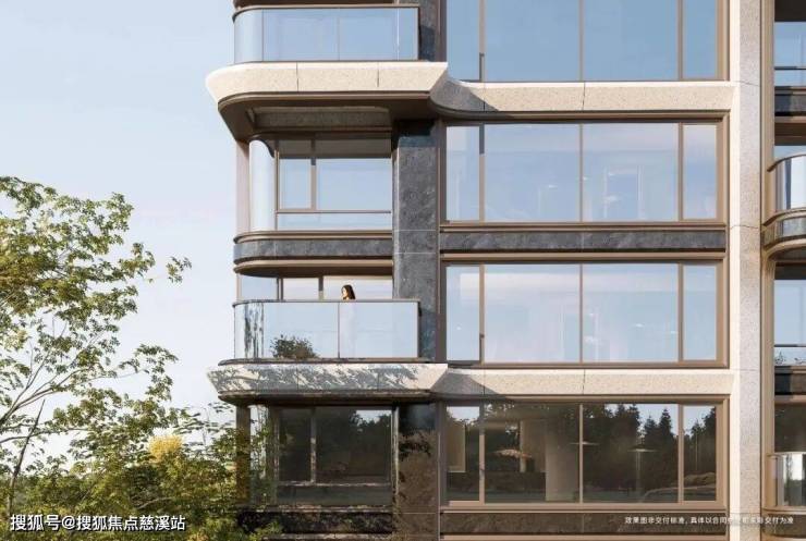 项目以石材(首层)+仿石铝板+陶板+金属格栅等高端选材,同时加上倒弧落地窗+LowE玻璃三玻两腔系统窗。