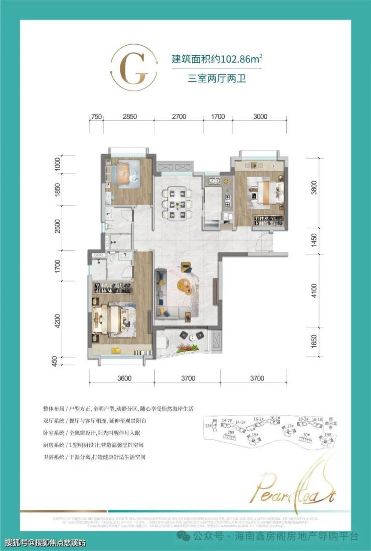G户型-建筑面积约102㎡ 三室两厅两卫:户型方正,动静分区