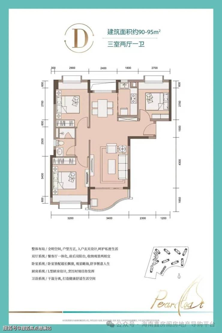 D户型-建筑面积约90-95㎡ 三室两厅一卫:餐客厅一体化,收纳观景两相宜