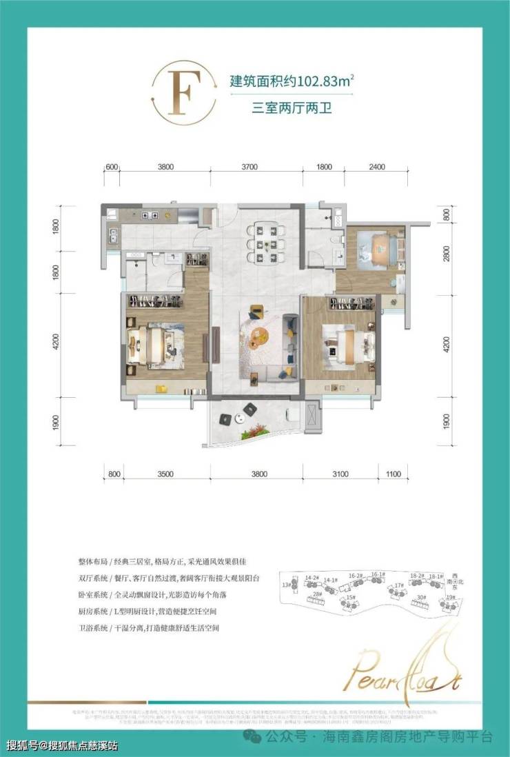 F户型-建筑面积约102㎡ 三室两厅两卫:餐客厅一体化,L型明厨设计