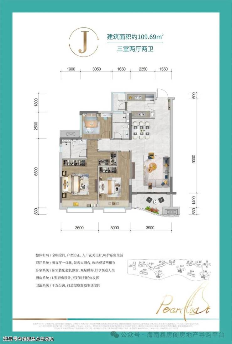 J户型-建筑面积约109㎡ 三室两厅两卫:餐客厅一体化,入户玄关设计