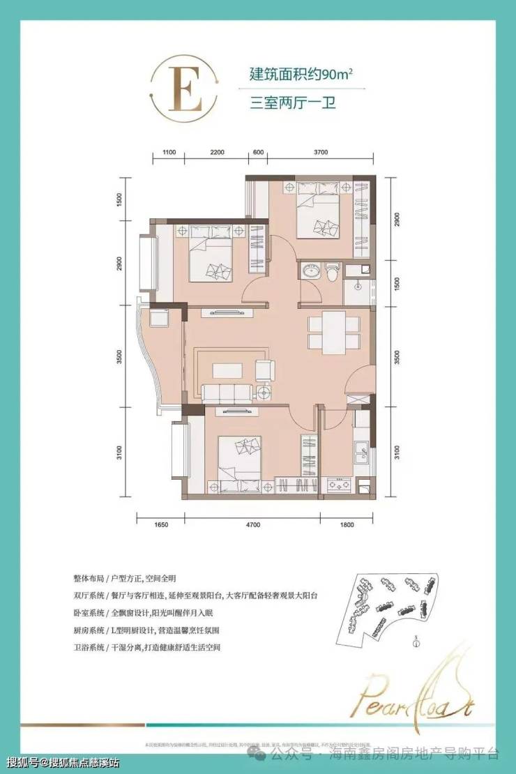 E户型-建筑面积约90㎡ 三室两厅一卫:餐客厅相连,配备轻奢观景阳台
