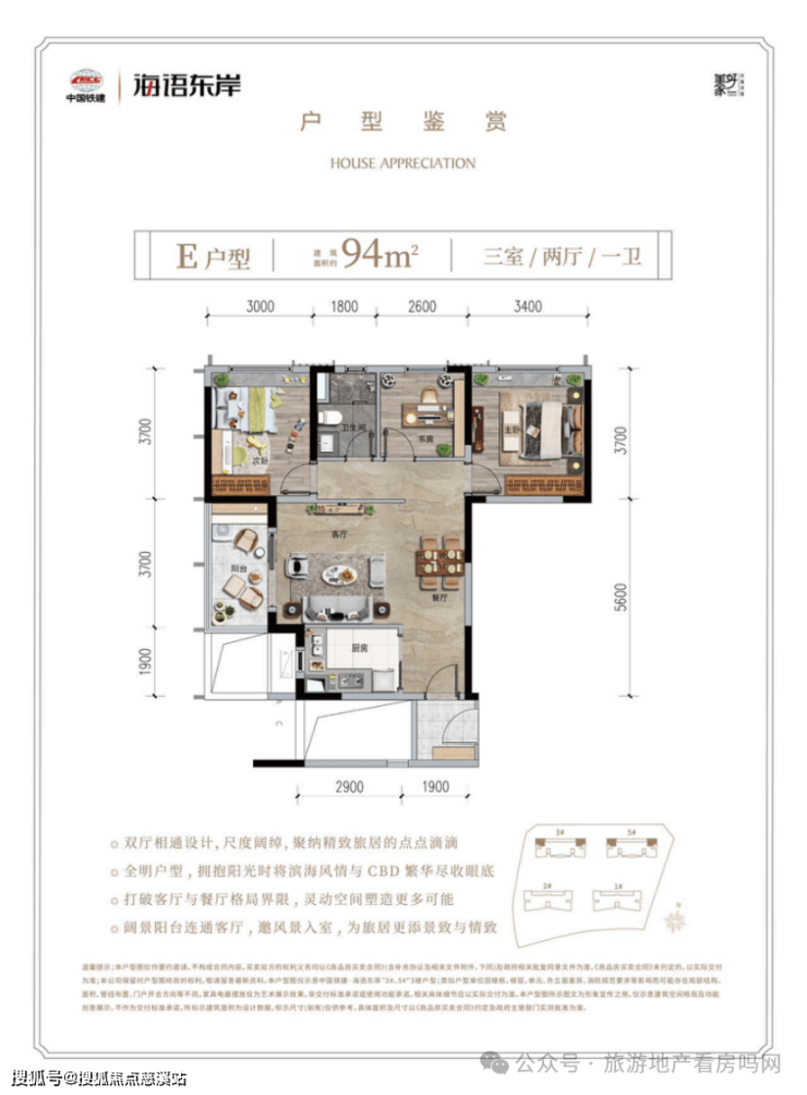 E户型:建筑面积约94㎡,三室两厅一卫。厅房方正实用,双厅相通设计,使用率高;全明户型,室内通透、采光通风良好;客厅布局合理,阔景阳台连通客厅,功能分区明显,动静分明,居家生活充满情趣。