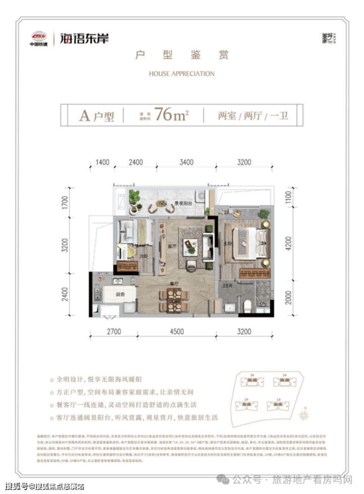 A户型:建筑面积约76㎡,两室两厅一卫。户型方正,全明户型,空间布局合理紧凑,客餐厅一线连通,阔绰客厅连通阔景阳台,开启快意旅居生活。