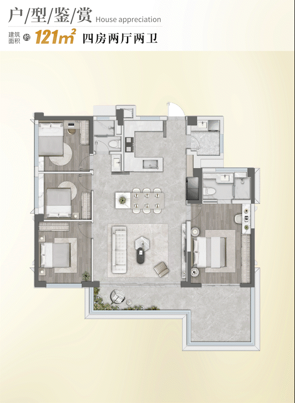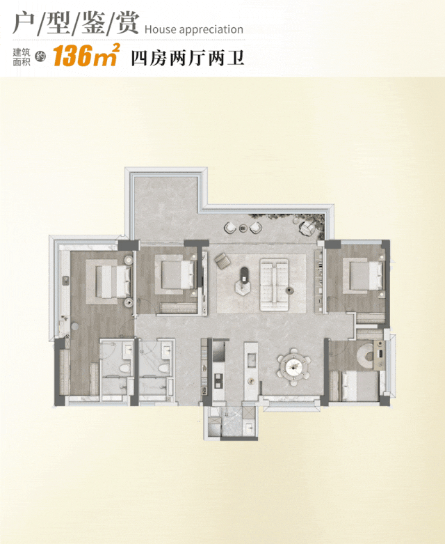 该户型为项目的标杆产品,以“四套房+主卧三开间+四阳台”的设计直接把高端改善拉满。