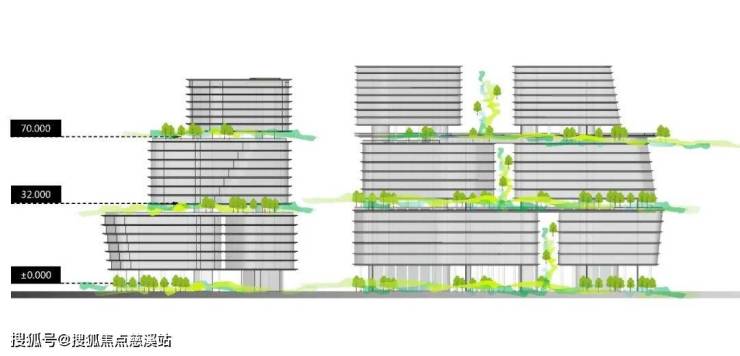 3、底层构造落客花园,办公底层架空,进一步退让出公共空间和绿化给场地,结合下沉庭院和坡道台阶,形成可从地库直进二层的联动落客大堂,完美结合了三亚气候特点,底层通高架空,形成天然的办公门厅落客区域。