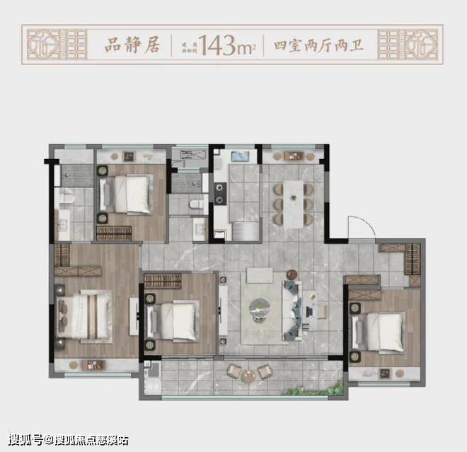 建筑面积约143㎡四房两厅两卫,同样做到了南北全飘窗、主卧套房、U型厨房,整体动静分离,客卫三段式干湿分离等,是预算更为充足的买房人不可错过的上品。