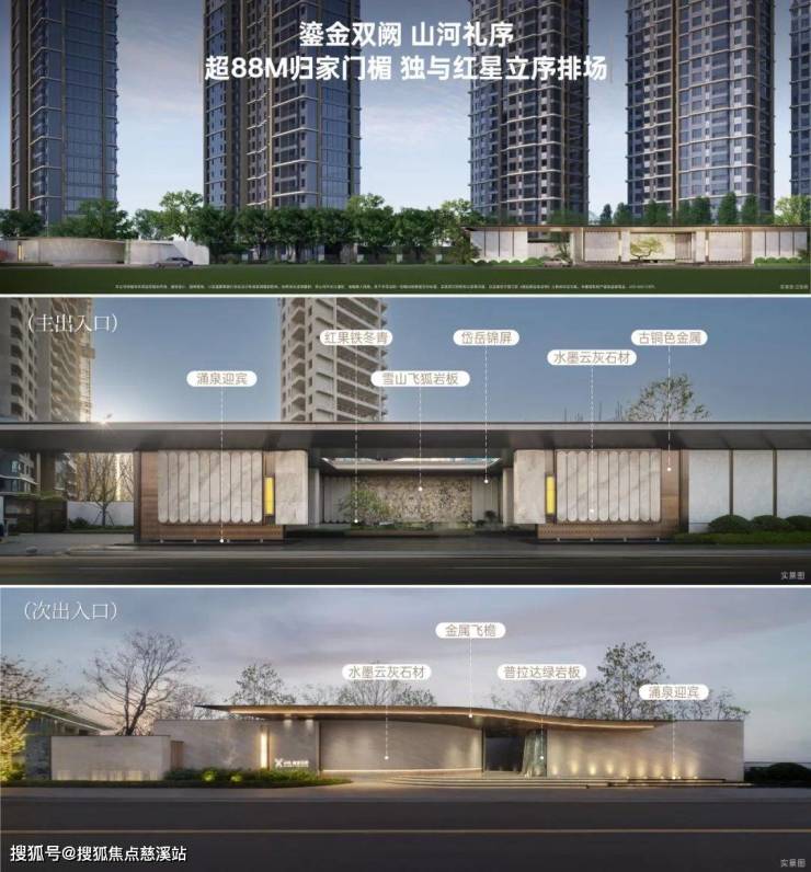 超88m城市级归家门楣,取意【双阙鎏金·山河礼序】,主入口以沉稳内敛的水墨云灰石材为主,以古铜金属镌刻logo,正面悬挂巴西进口近约50m²雪山飞狐岩板景墙,借由其独特的质感与透光性,打造"碧玉翡翠生养之境",演绎"天河玉屏"的永恒雅意;次入口以普拉达绿奢石结合金属飞檐,寓意四季顺遂。