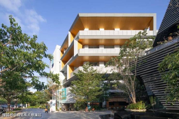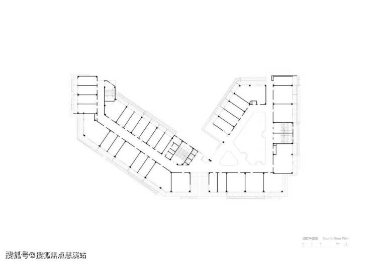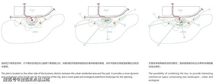 三、主要面对湿地公园 ?这虽自然,但会忽视北侧的入口关系;若优先营造街道立面,又容易使建筑背对公园,姿态消极。我们试图兼顾两者。我们尝试采用S型的体量,相互缠绕,从而创造两个庭院空间,并形成穿过建筑的通道。西侧的庭院和道路相连,形成类似城市广场的放大节点;东侧的中庭更具探索性,同时向上和向后延伸连接南侧的公园。两个庭院通过部分下沉的空间来连接,不仅提供了宝贵的阴凉,更在公园与街道间构建了一条“洄游”路径。行人可在此自由穿梭,体验探索的乐趣,弥补了新区所缺失的宜人步行感受。