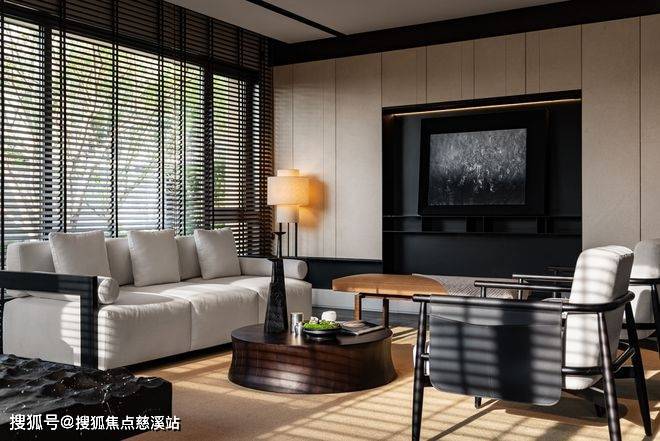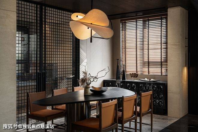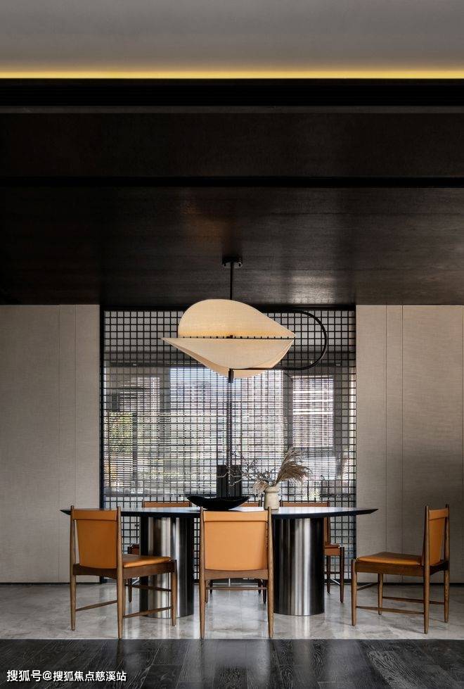 一层餐厅与中厨采用对称的设计布局,通过格栅门将客、餐、厨三个空间连接在一起,透过木百叶、格栅门剪裁光影,大面积的落地玻璃设计,将自然光影引入室内。