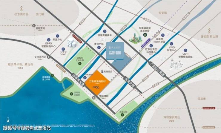 项目周边,就有三条地铁线环绕。东莞2号线(在建中,预计27年通车)位于南侧滨海湾大道上,毗邻项目的就有交椅湾站和交椅湾西站(预计2027年完工);东莞3号线(前期筹备阶段)位于项目东侧中海路。东莞9号线(规划中)位于项目北侧东湾大道。