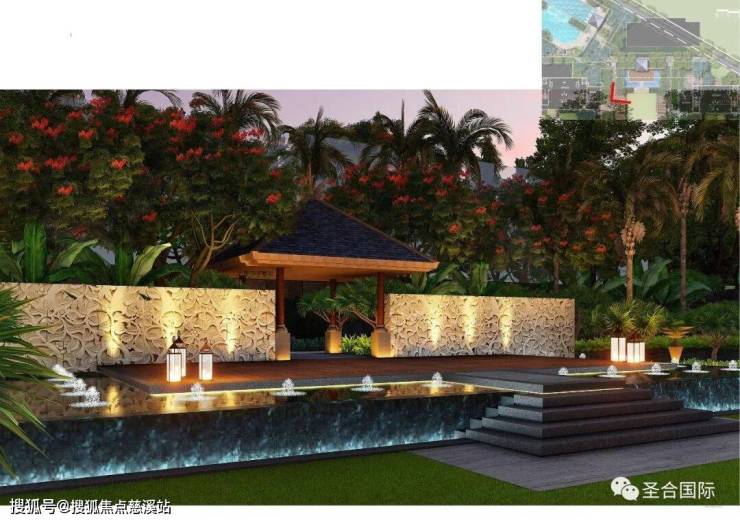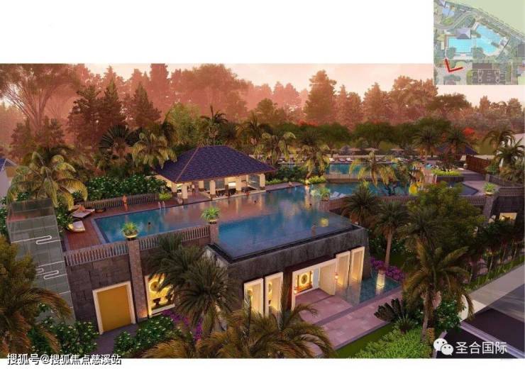 水面结合椰林尽显度假氛围,葱郁的热带植物渲染东南亚风情。