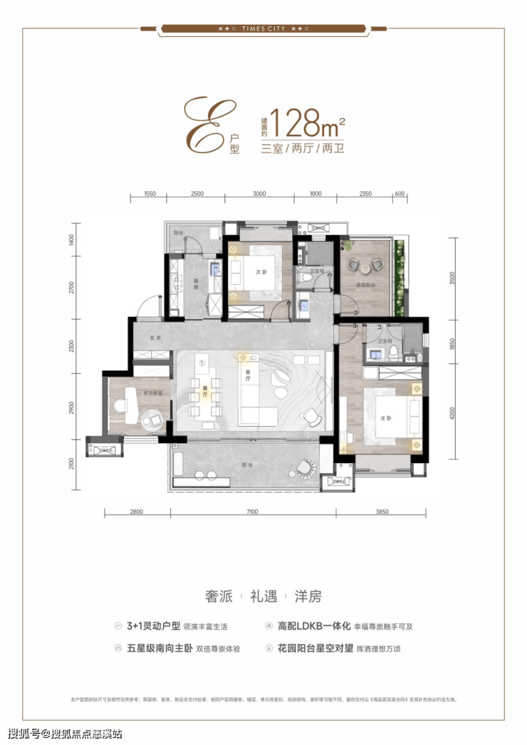 户型设计:主力户型为建面约103-128㎡的2-3居,采用LDKB一体化设计,部分户型配备超6米阔尺阳台,采光与通风优越。