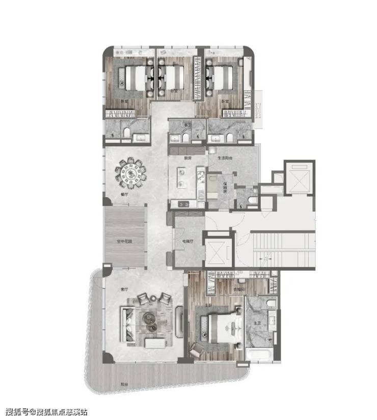 大平层采用的是单梯入户,户型的使用率非常高,我们首先来看看350㎡的大平层(5室2厅5卫),高层是带德系精装修交付的。