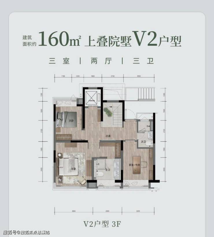 上叠院墅 V2 户型,约 160㎡(或 158.1㎡ ),三室两厅三卫。有私人电梯、双重玄关,约 6.1 米度假观景横厅,270° 三面采光 。约 30㎡L 型花园露台,能欣赏 270° 环幕景观。主卧奢阔,配备步入式衣帽间与独立卫浴,还有可拓展空间随心改造。