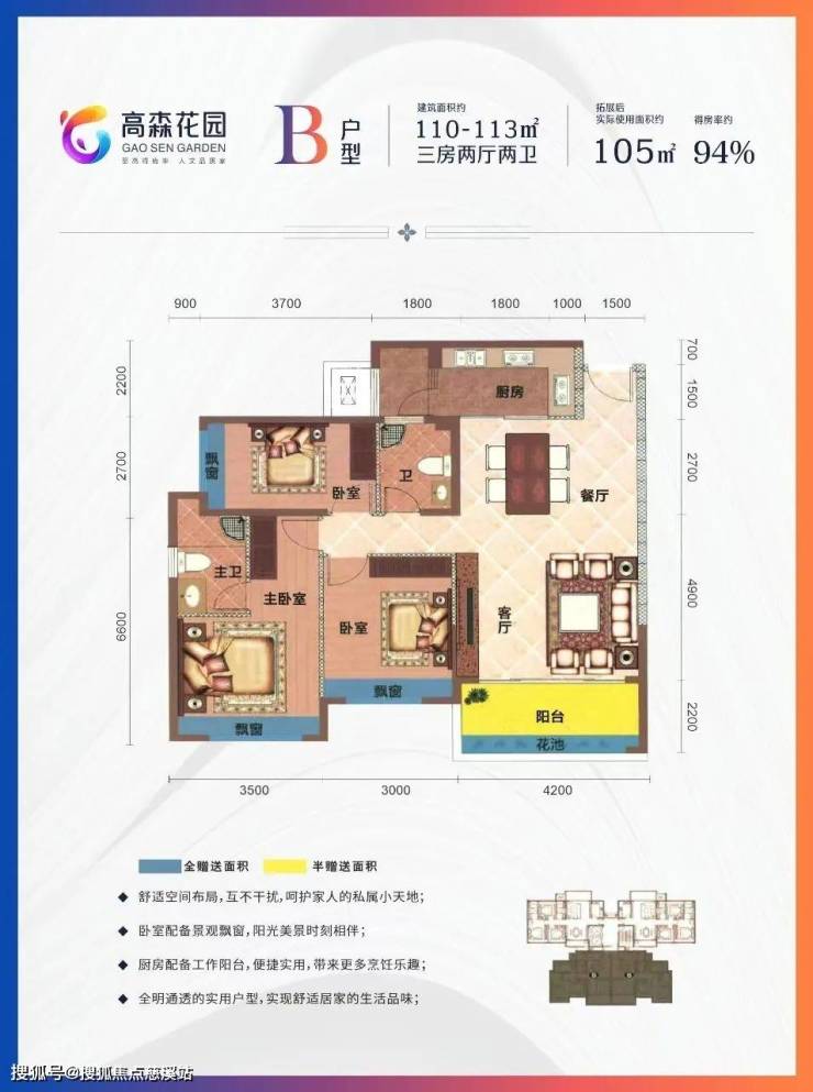 B户型 三房两厅两卫 得房率94%