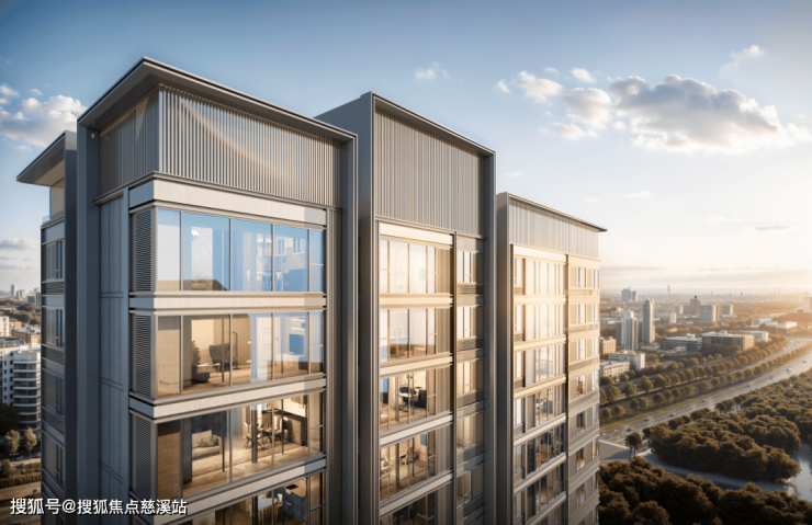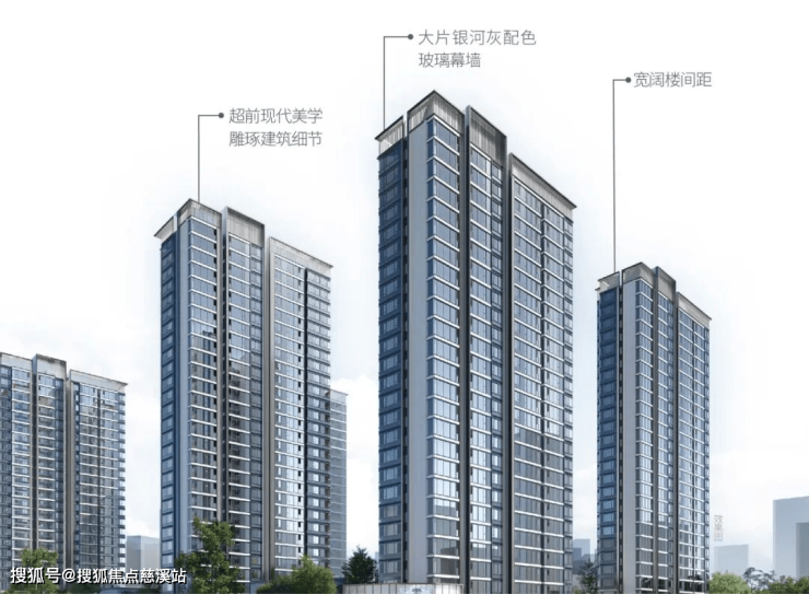 立面设计以简约、时尚为主基调,精致简约,讲究尺度的把控,大面简约,局部细节刻画。通过横向线条,不同的建筑色块,从大比例上控制建筑形象。主要墙体以米白色、深灰色涂料及大面积玻璃作为墙面的主要材料,加上铝合金型材的线条。建筑整体挺拔,干净整洁。底部近人尺度,通过建筑材料以及格栅、门头、线脚等较为细腻的建筑细节,着重塑造温馨、宜居的建筑氛围。