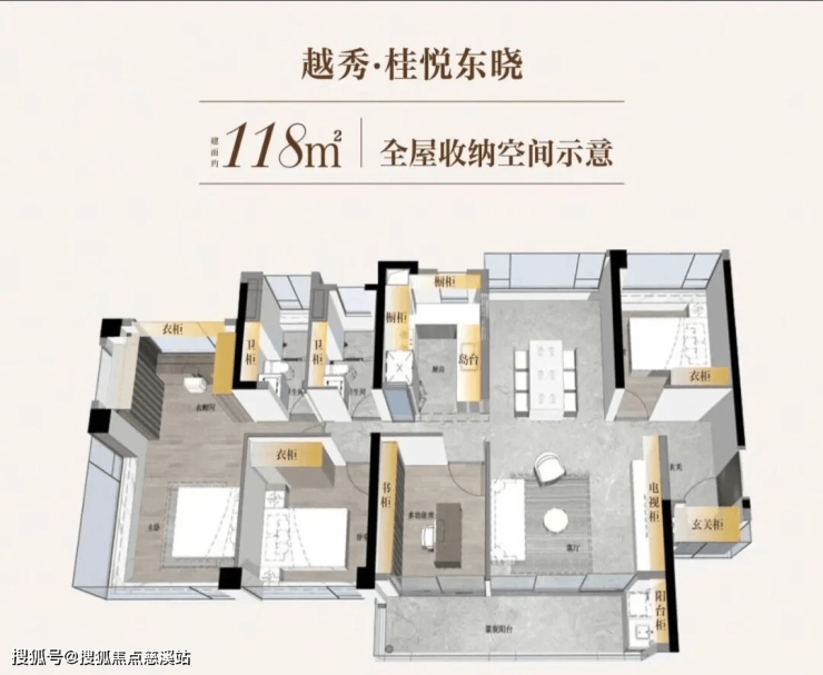 建面约118平旗舰四房户型,全屋做到五开间朝南+南北对流。