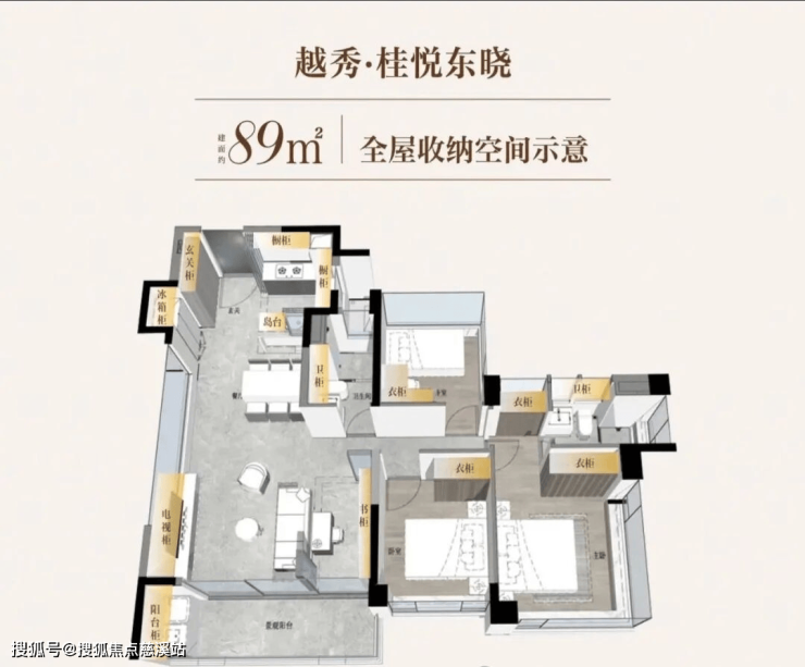 约89平户型,全屋做到四开间朝南,客厅开间也做到约5.2米。