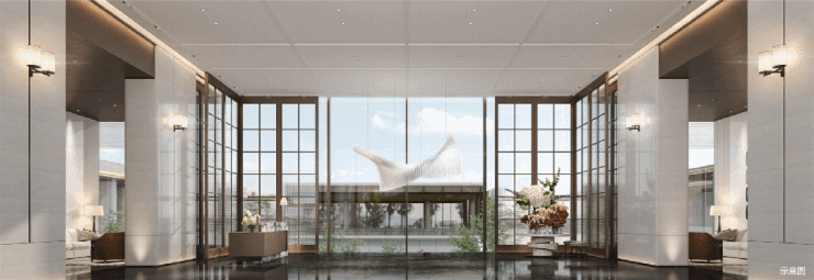 入户大堂采用仿石砖与金属格栅搭配,尽显轻奢;架空层与园林联动打造功能空间;社区东侧专设通道连接规划中的滨海乐园,未来业主可便捷抵达休闲场地。