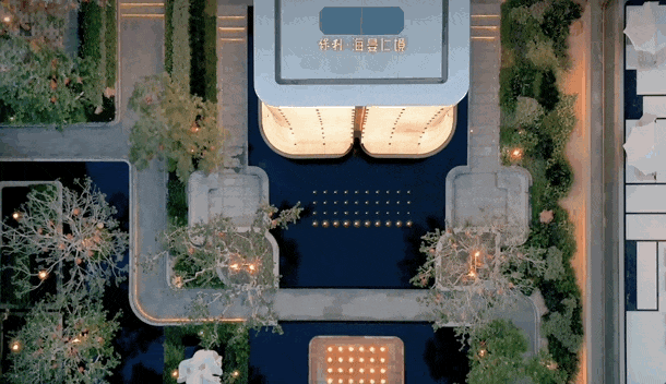标志性建筑“海玉辉堂”如风帆矗立庭院中央,透光云石温润奢华,黎锦意象的水轴倒映建筑,自带奢侈品秀场般的高级张力。